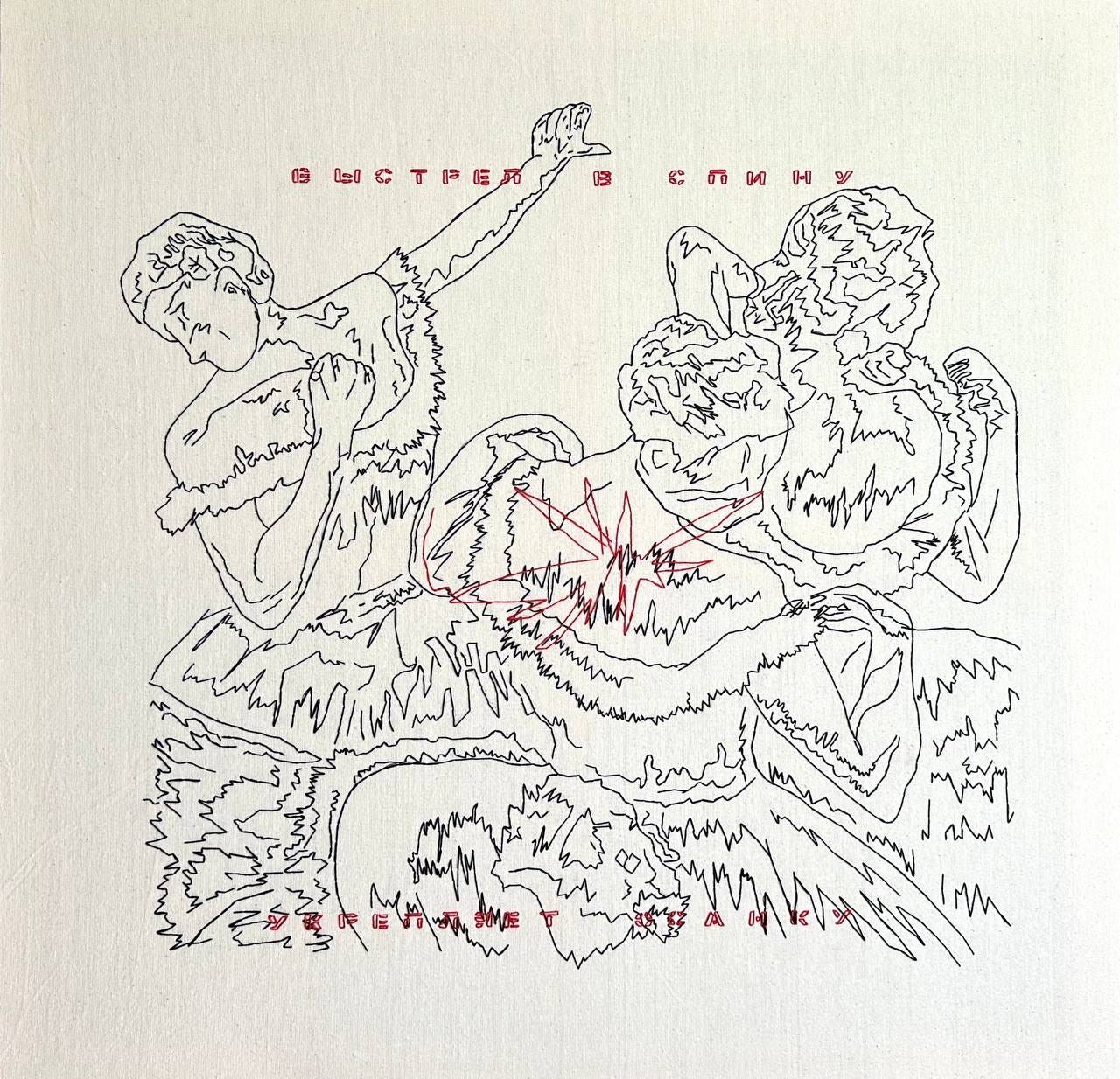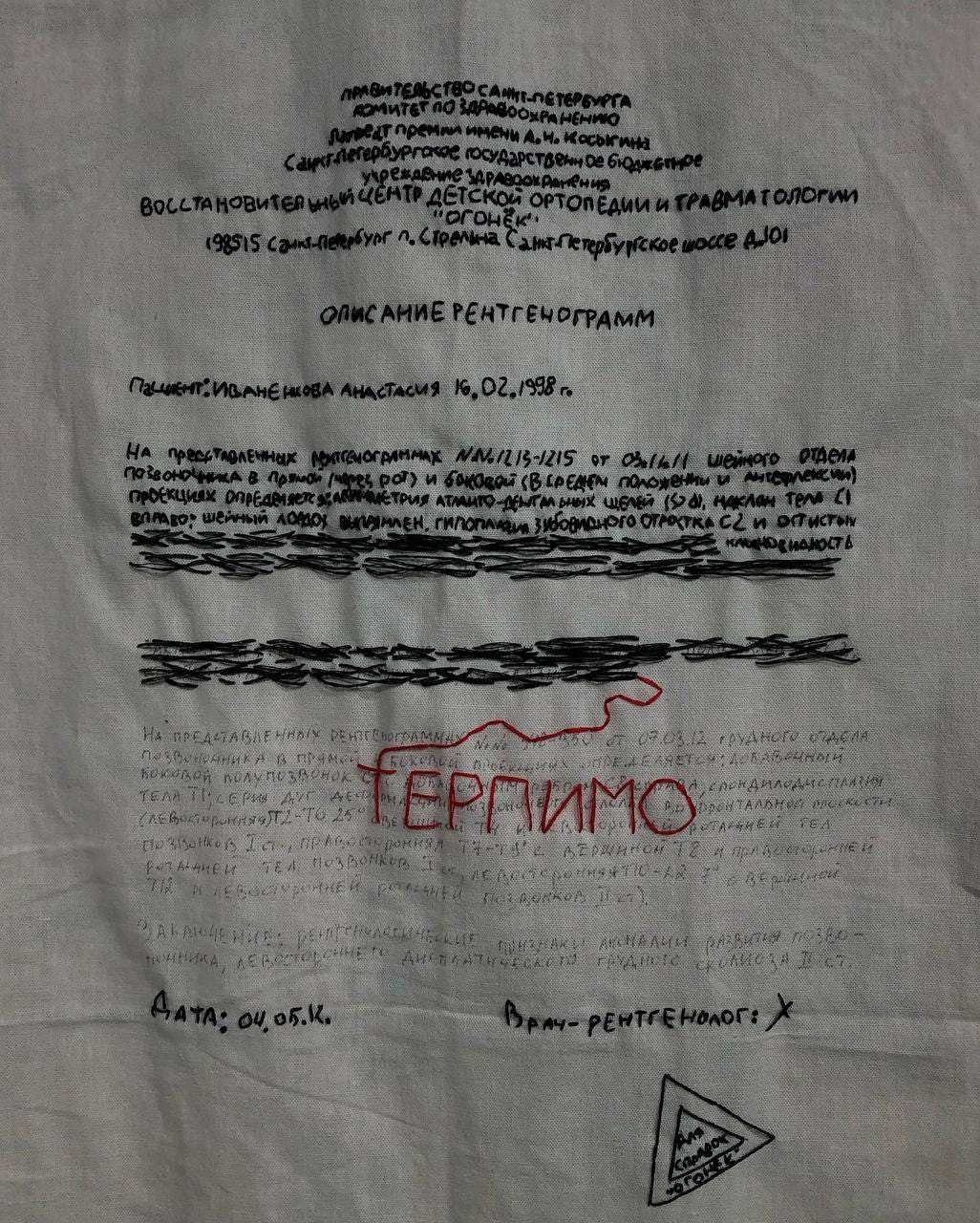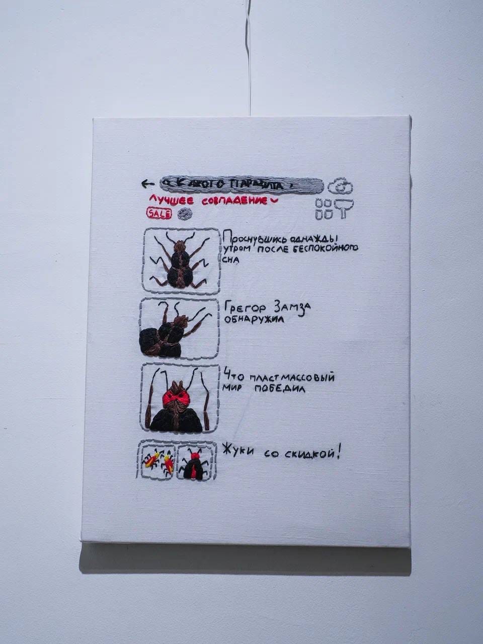 —> Одна из моих первых осознанных текстильных работ – вышивка с жучком «Грегор Замза». Она стала моей первой работой, с которой я пришла в объединение Паразит (старейшая арт-группа Санкт-Петербурга). Выставка называлась «Паразит в зеркале Алиэкспресс», и я сделала некую работу-комикс. Жучок в окошках для товаров, а справа первая строчка из «Превращения» Франца Кафки, которое сводится к фразе Летова «пластмассовый мир победил». На самом деле, тема для меня была сложная, и поэтому родился такой сложный и многослойный образ.