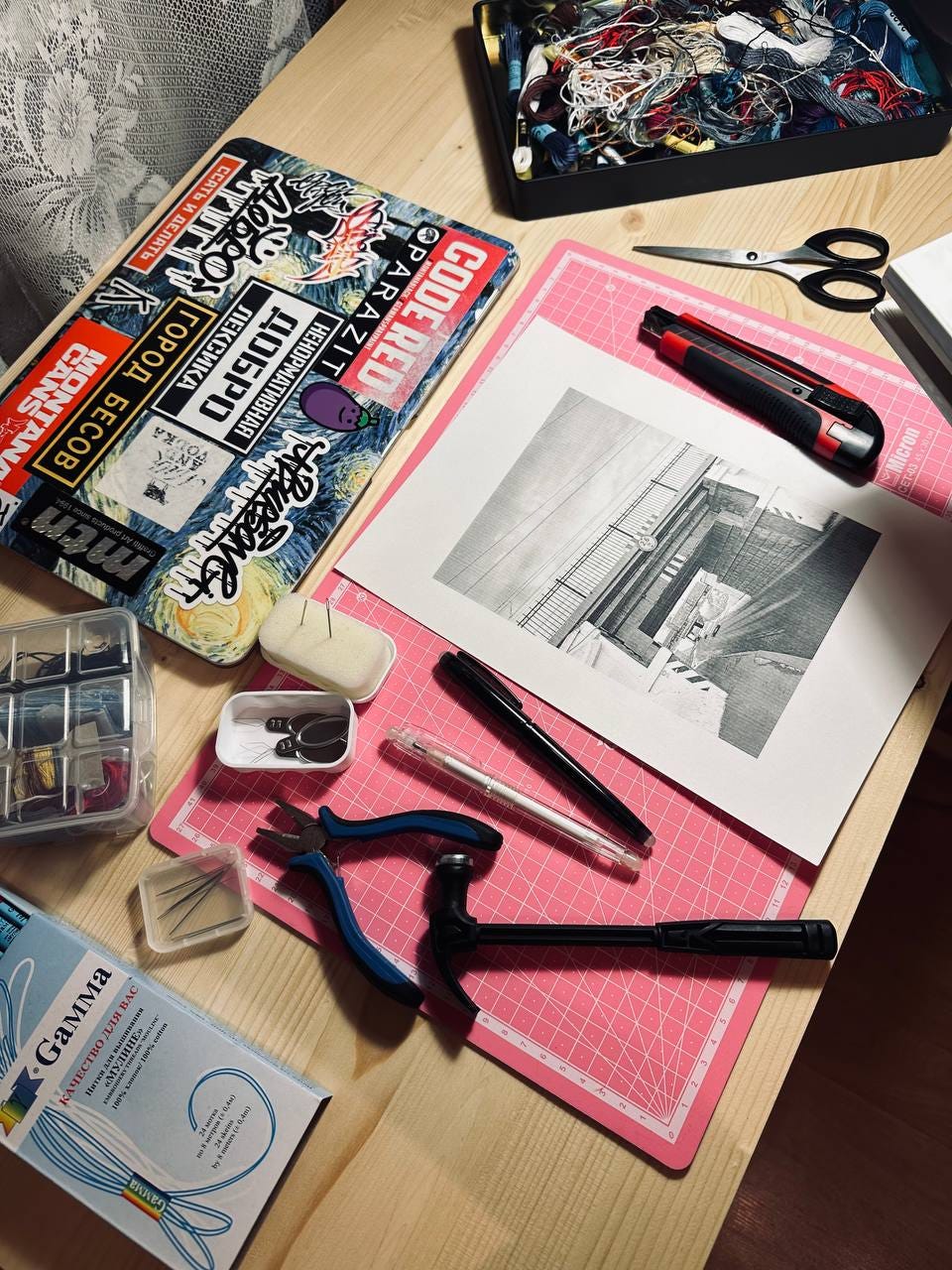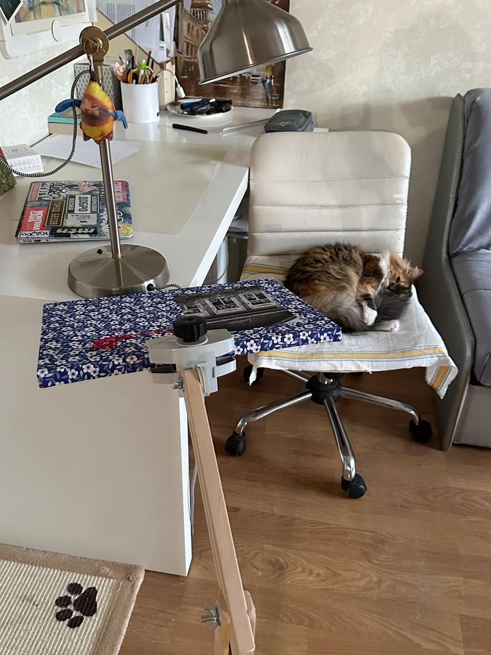 —> Мое рабочее место это стол, табуретка, лампа и держатель для пялец. Стол стараюсь вне работы держать пустым, потому что в творческом процессе на него неизбежно попадает все что угодно, от бумаги до плоскогубцев с молотками. А после творческого процесса всегда убираю его, потому что живу с кошкой и панически боюсь, что она захочет отведать нитку.