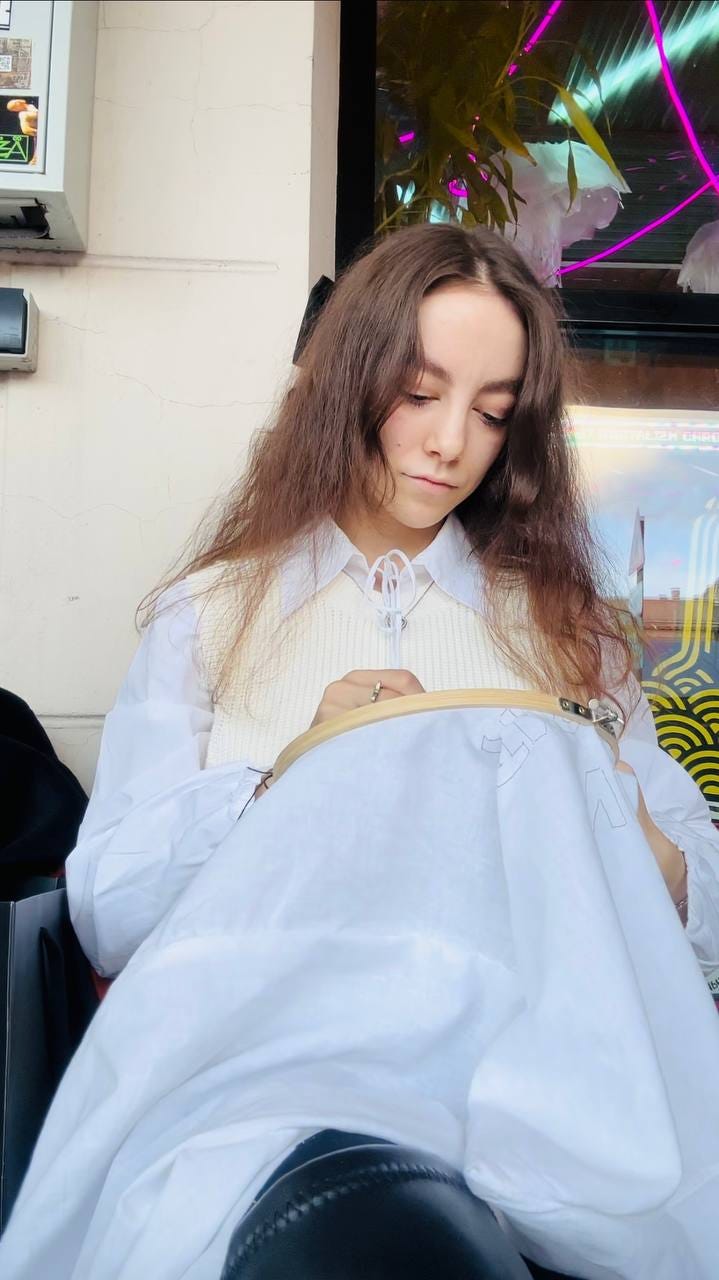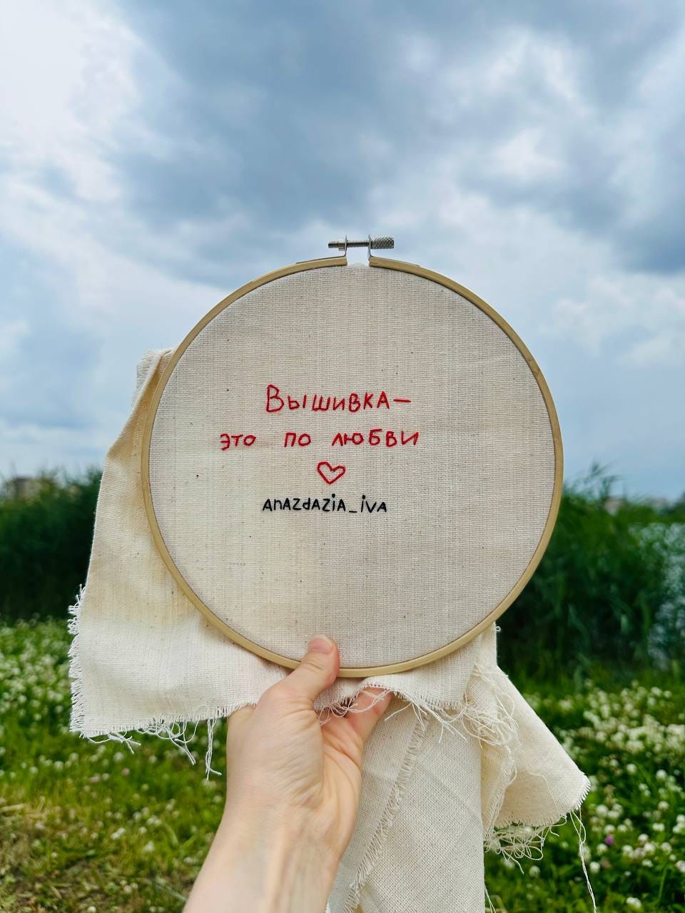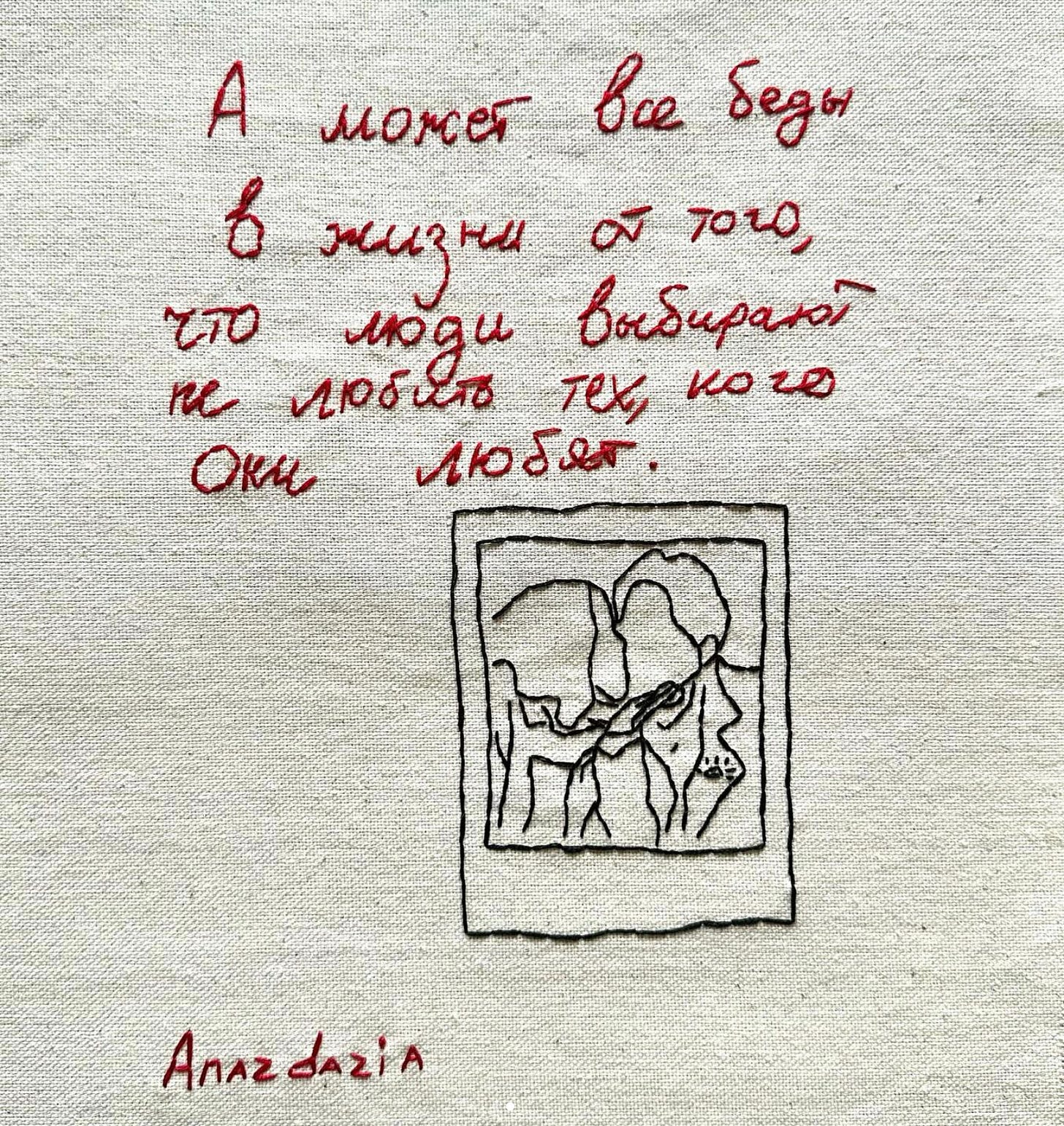 —> Для меня вышивка оказалась формой любви, которую я вижу наощупь. Не было конкретных причин как, почему, как я к этому пришла и т.д. и т.п., я просто стала вышивать и не смогла оторваться от нее ни на день. Когда я вышиваю я иногда даже забываю моргать, мысленно говорю себе «моргни». Это моя молитва руками, через которую я могу все рассказать миру.
