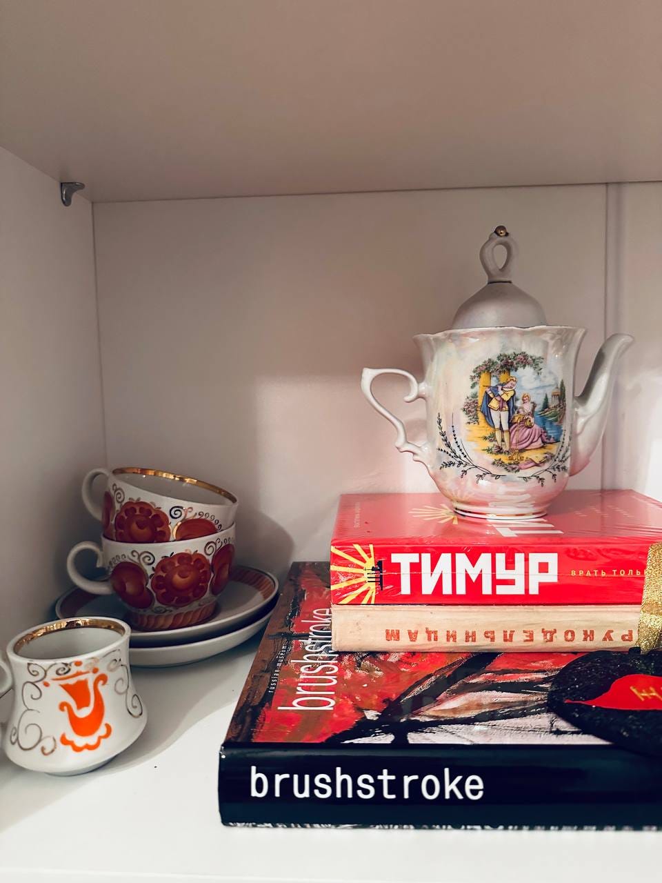 —> В прошлом году захотелось оформить все свои любимые вещи в одном месте, так у меня появился шкаф с сокровищами. Там я храню книги по искусству, по текстилю, короба с нитками мулине и другие милые сердцу вещи. Одни из них: