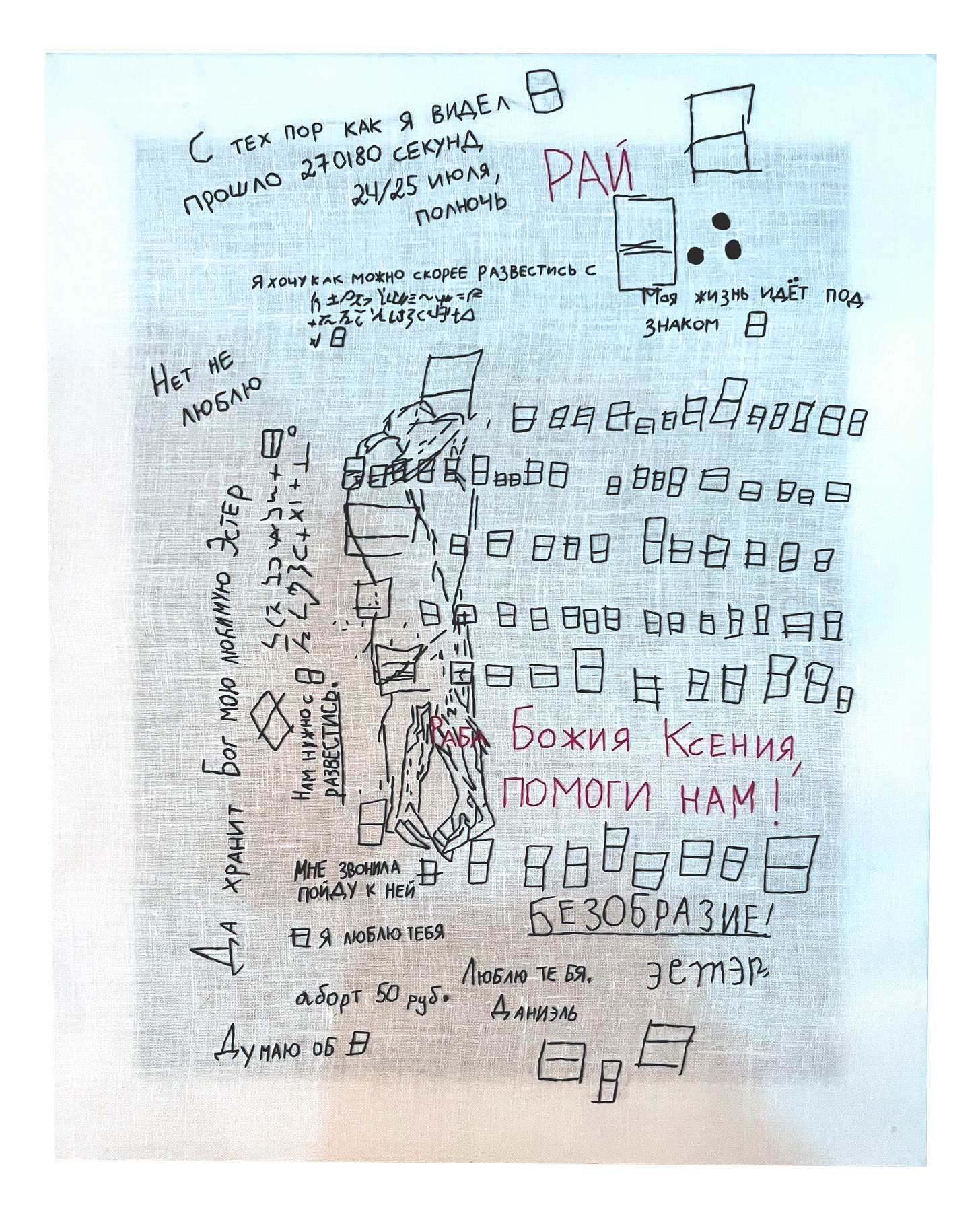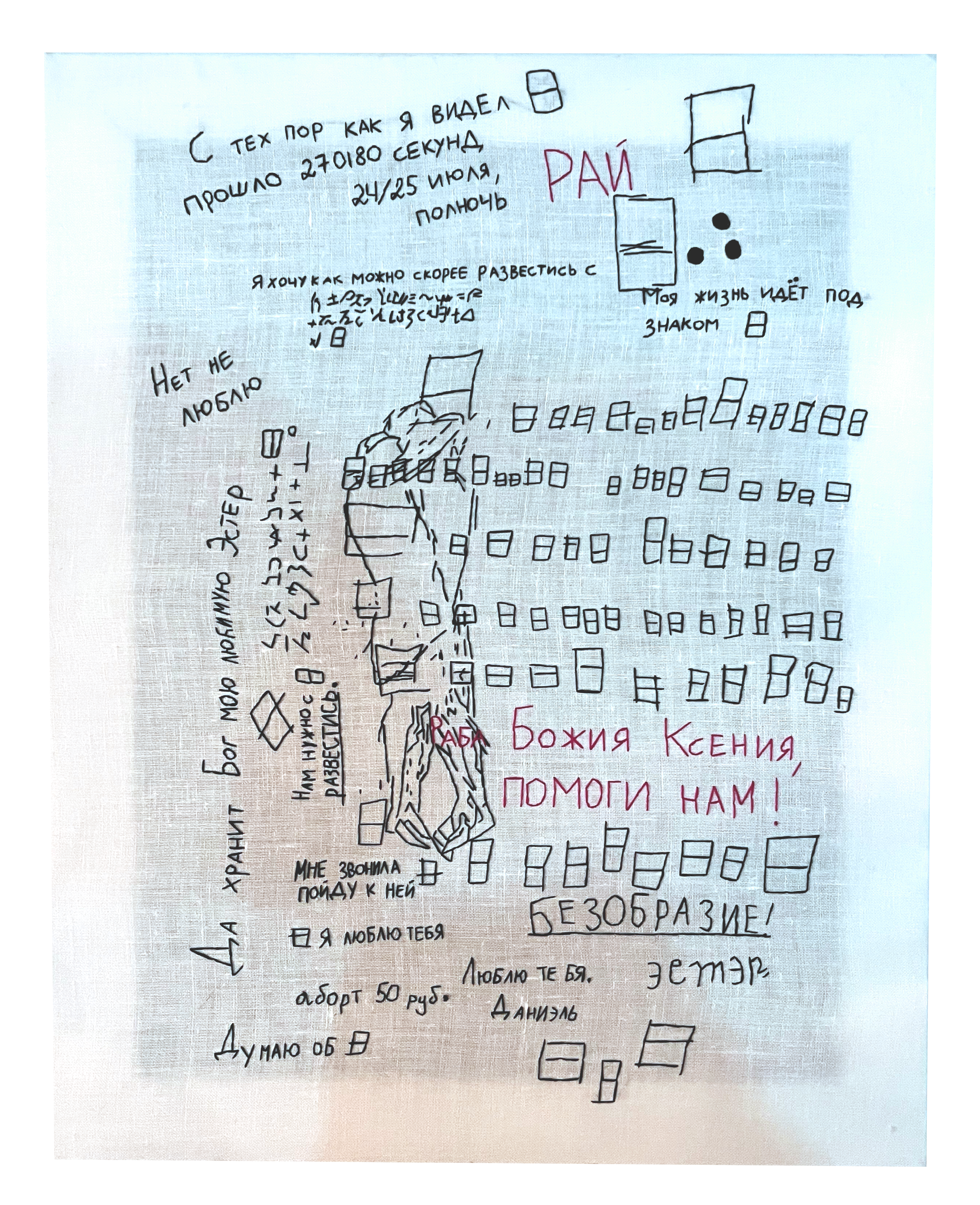 Первый раз я увидела Настину работу “Танталовы муки” в кабаре Шум в Петербурге, мы заходили туда во время Маршрута старухи, прогулки посвященной Даниилу Хармсу. Я тогда сфотографировала работу, чтобы найти художницу, но забыла. Позже всё-таки случайно нашла и, когда читала Настины ответы вспомнила про это летнее впечатление и нашла фотографию у себя в телефоне.