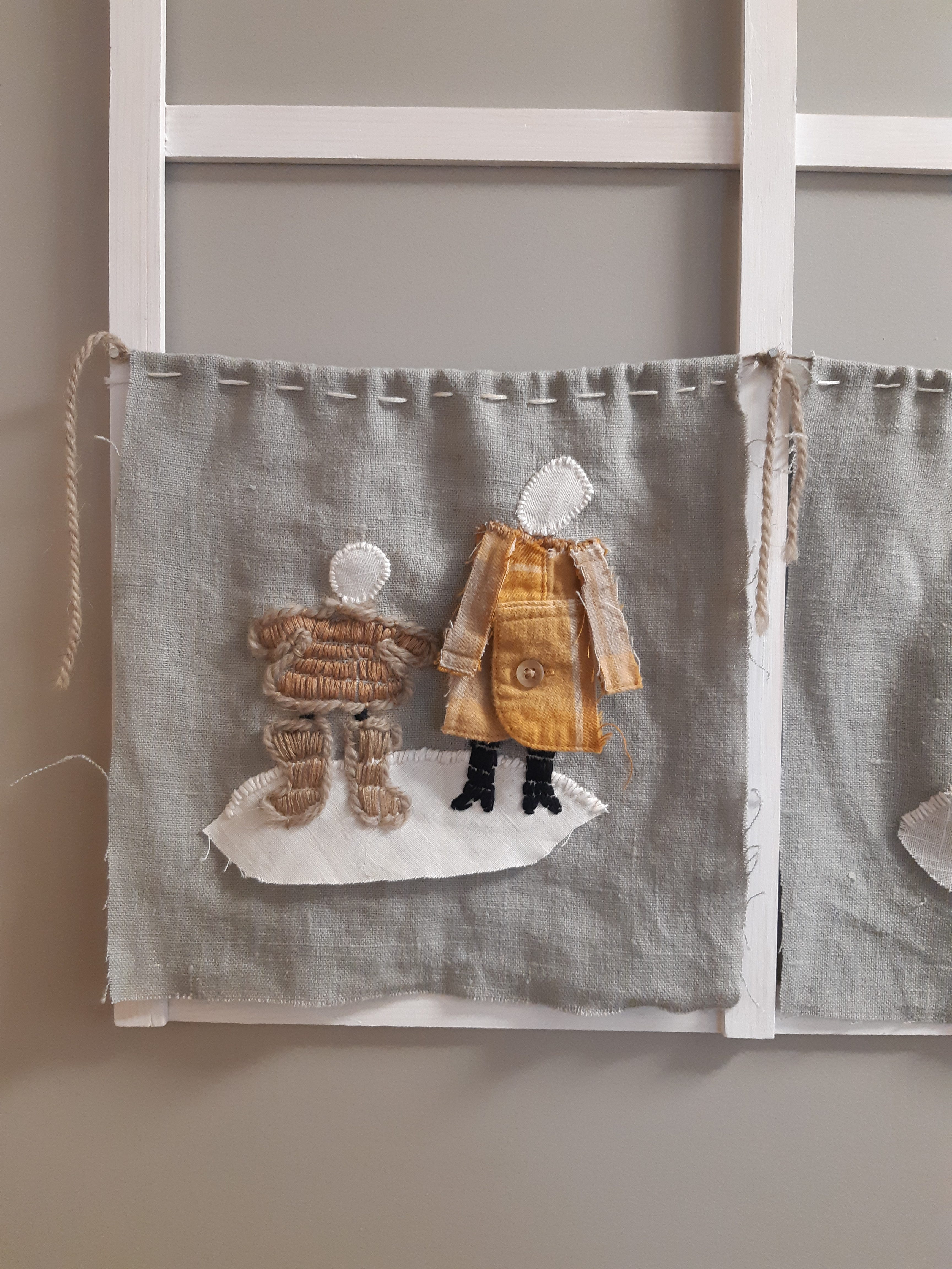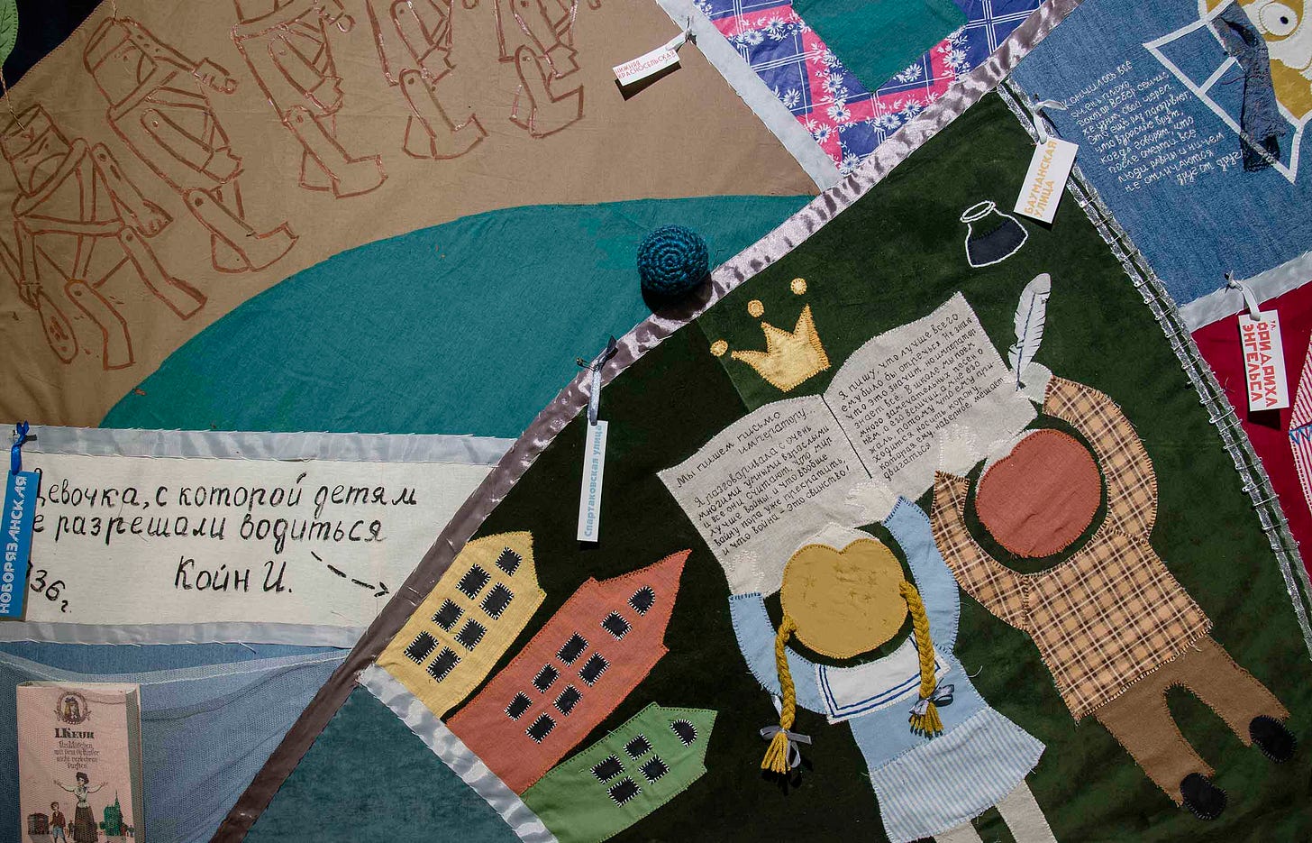 —> Во-первых — это текстильная карта района для выставки «Бауманские узоры» (ЦТИ Фабрика), которую мы делали вместе с комиксисткой Яной Кулишовой. Персонажи, которыми мы населили кварталы, рождались по мере прогулок по району, и были построены на личных ассоциациях, воспоминаниях и фантазиях. Был тяжелый период, и в карте мы ушли в тему детства, фантазий, игр, творчества и воображения. И почувствовали на себе терапию текстиля. Для меня эта работа важна во многом, потому что дала понять, что в любой непонятной ситуации — садиcь шить. А лучше пригласи ещё родных и друзей помогать. Ближе к открытию так получилось, что я осталась один на один с этим немалым полотном и моя семья и друзья и их дети максимально включились и также ползали до изнеможения пришивая последние кварталы и их жителей, чтобы успеть к открытию.