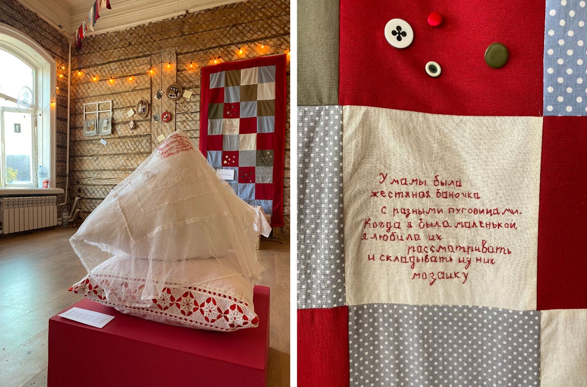 Очень любим ездить в Кинешму, это городок на Волге в Ивановской области, я и сама его недавно узнала, когда познакомилась с прекрасной Марией, основательницей «Ямузея» (музей истории семьи), мы c тех пор сделали немало всего вместе и продолжаем сотрудничество. А началось всё с открытия моей выставки в её музее — «Реконструкция памяти: вышивая семейный архив», где были не только мои работы, но и участниц воркшопов.