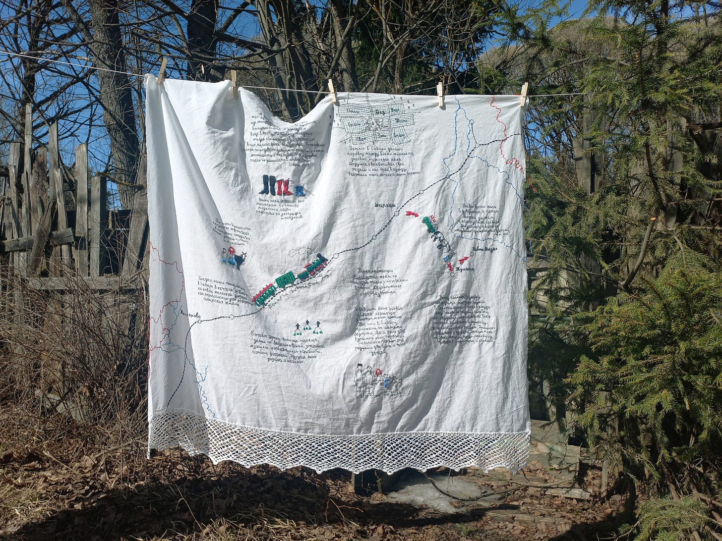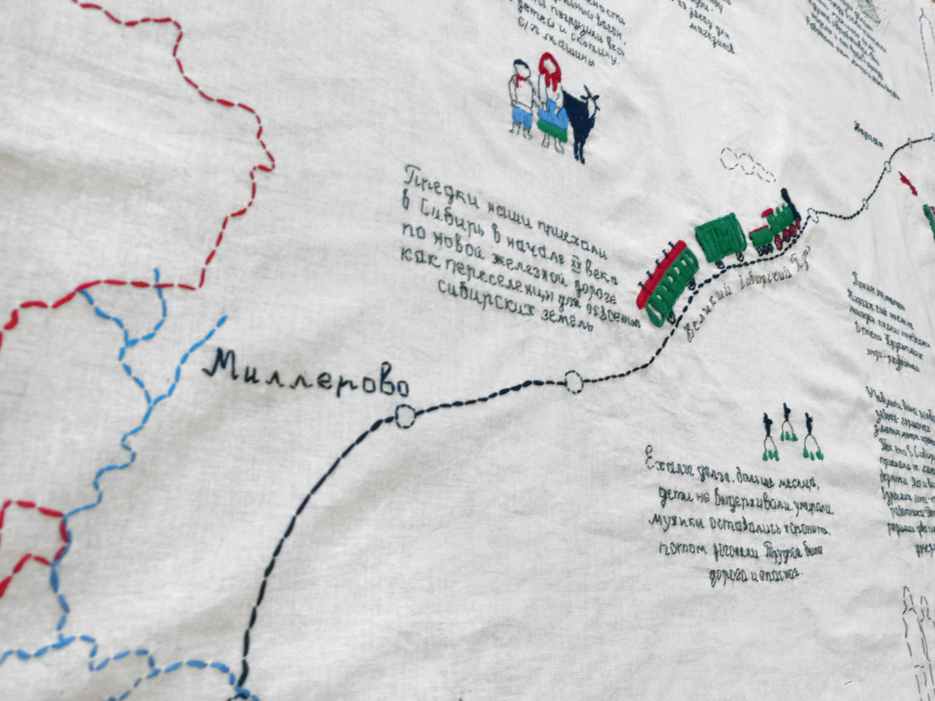 Вторая работа «Занавесь. Дневник воспоминаний». Это продолжающийся проект по мере того, как я изучаю записи бабушки по истории семьи. Первые слова рукописи «Предки наши приехали в Сибирь в начале 20 века по Новой железной дороге как переселенцы для освоения свободных сибирских земель…» погрузили меня не только в историю моей семьи, но и больше — в историю российских крестьян-переселенцев начала 20 века, на долю которых выпало немало потрясений — переселение, первая мировая война, революция, коллективизация и раскулачивание, репрессии, вторая мировая война, разорение деревень и наконец, переезд в город. Мне хотелось в полной мере погрузиться в эти тексты и разобраться в каждом событии этой рукописи, пройти (прошить) весь этот путь сначала и до того места, где уже родилась я.
