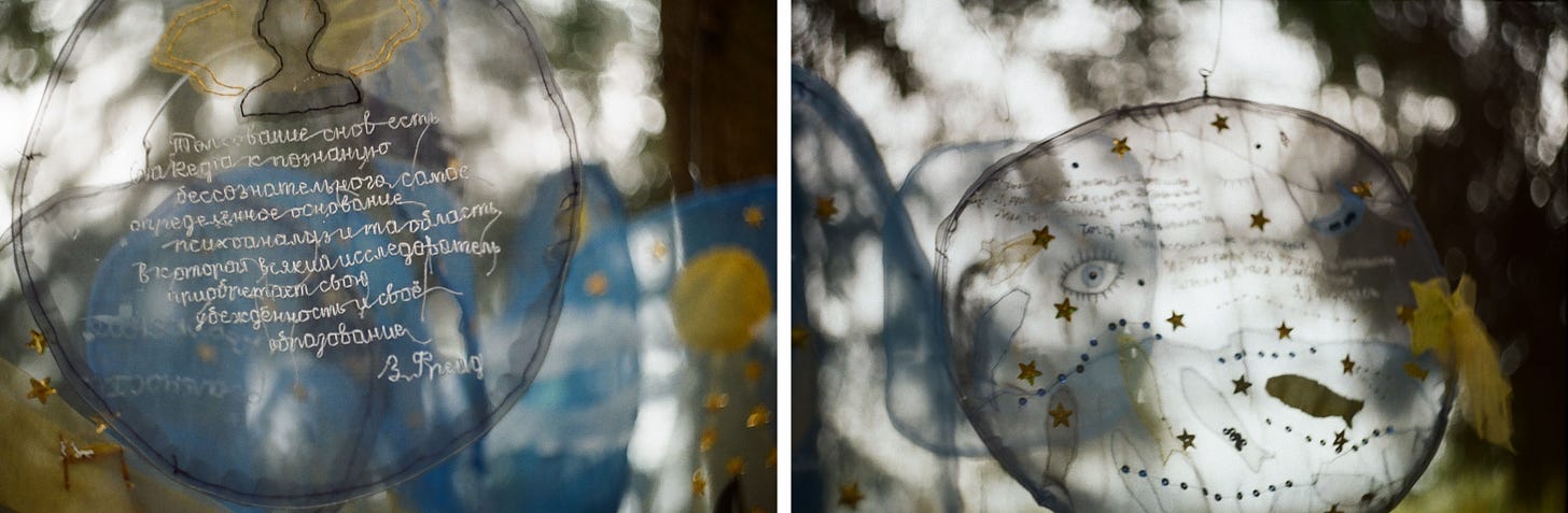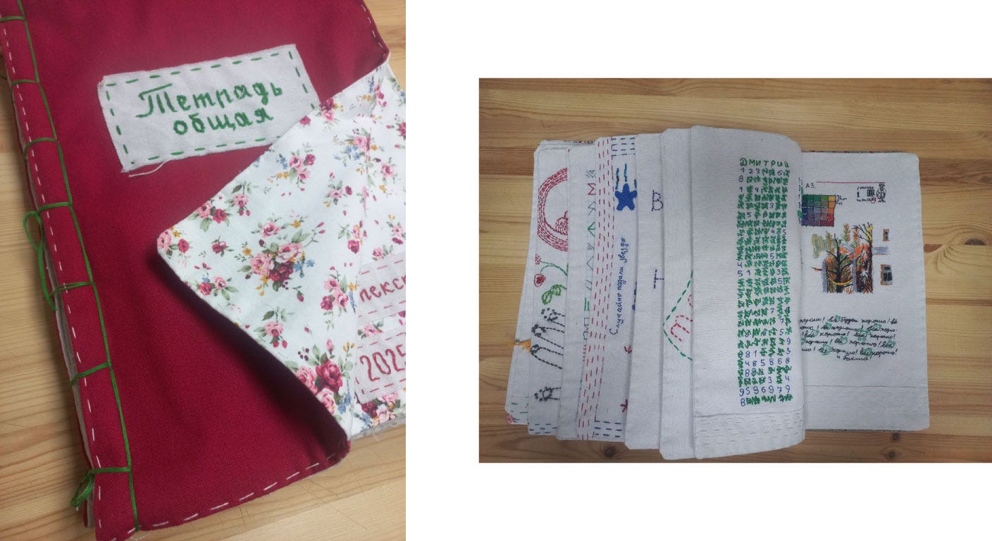 И еще я вспомнила о группе или нехудожественном объединении "Тексты и текстиль". Основной состав ее участниц сформировался после моей лаборатории в библиотеке Некрасова “Тексты и текстиль”, где мы вышивали тексты, искали аналогии между текстилем и словом, переплетали нити и смыслы. После завершения курса группа продолжила расти онлайн в чате. Мы делаем совместные проекты на определённую тему. Например, мы cделали мобиль, каждый элемент которого отражал размышления участниц о снах, интерпретациях и пр. Ещё есть текстильная общая тетрадь, посвященная рефлексии о девичьей культуре письма: дневниках, песенниках, анкетах и прочем.