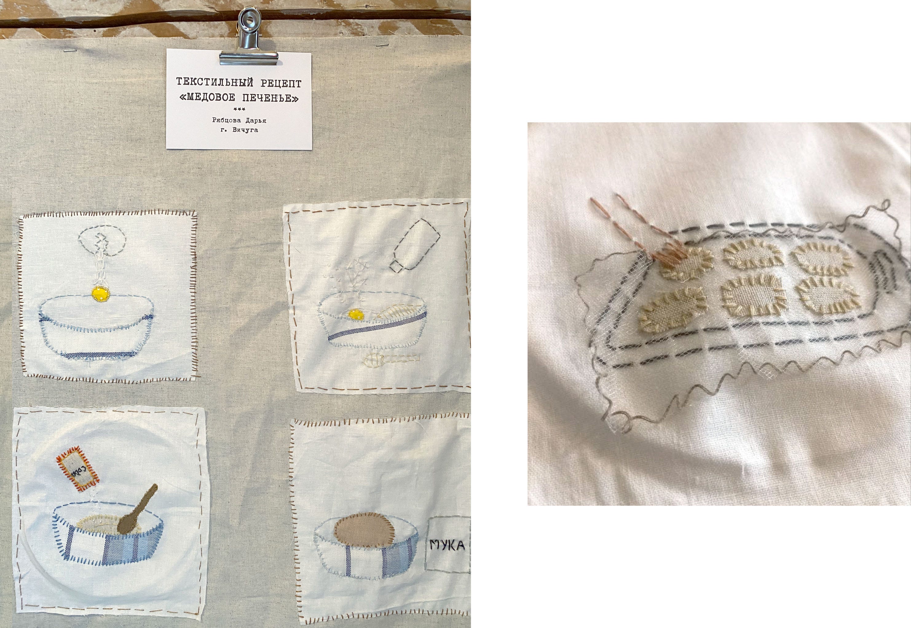 Я сама мечтала вышить какой-то рецепт, но всё руки не доходили и вот на лаборатории для подростков из Ивановской области мы делали разные проекты и выяснилось, что у одной девочки семейный новогодний рецепт это медовое печенье. Я ей предложила его вышивать и ура! она согласилась и ведь вышила.