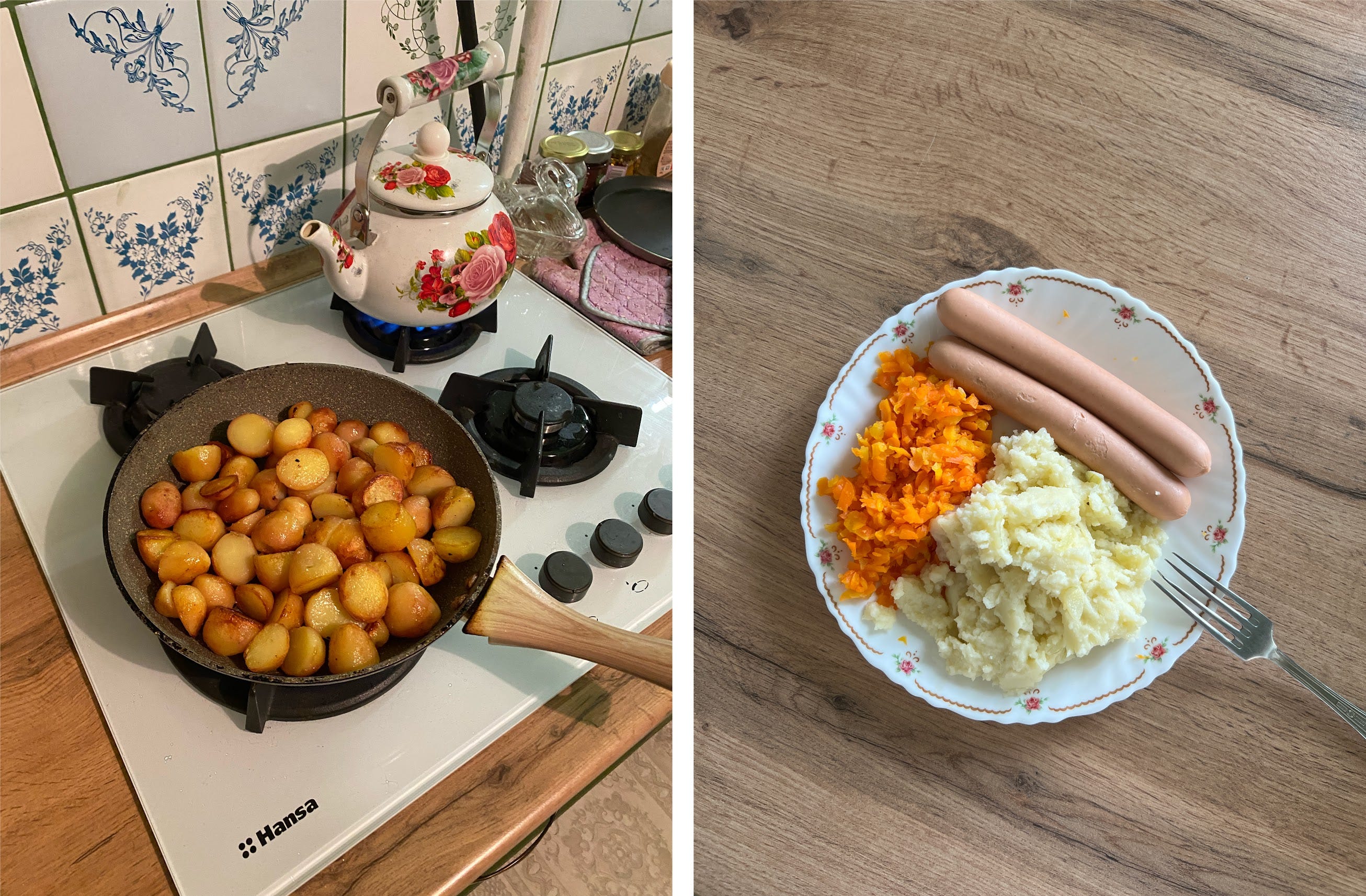 —> Я обожаю картошку, во всех видах, особенно пюре. В детстве часто лежала в больнице из-за проблем с желудком, и нам там давали пюре с натёртой варёной морковкой, я просто балдею от этого сочетания, а если туда ещё добавить веганскую сосиску — вообще отвал башки.