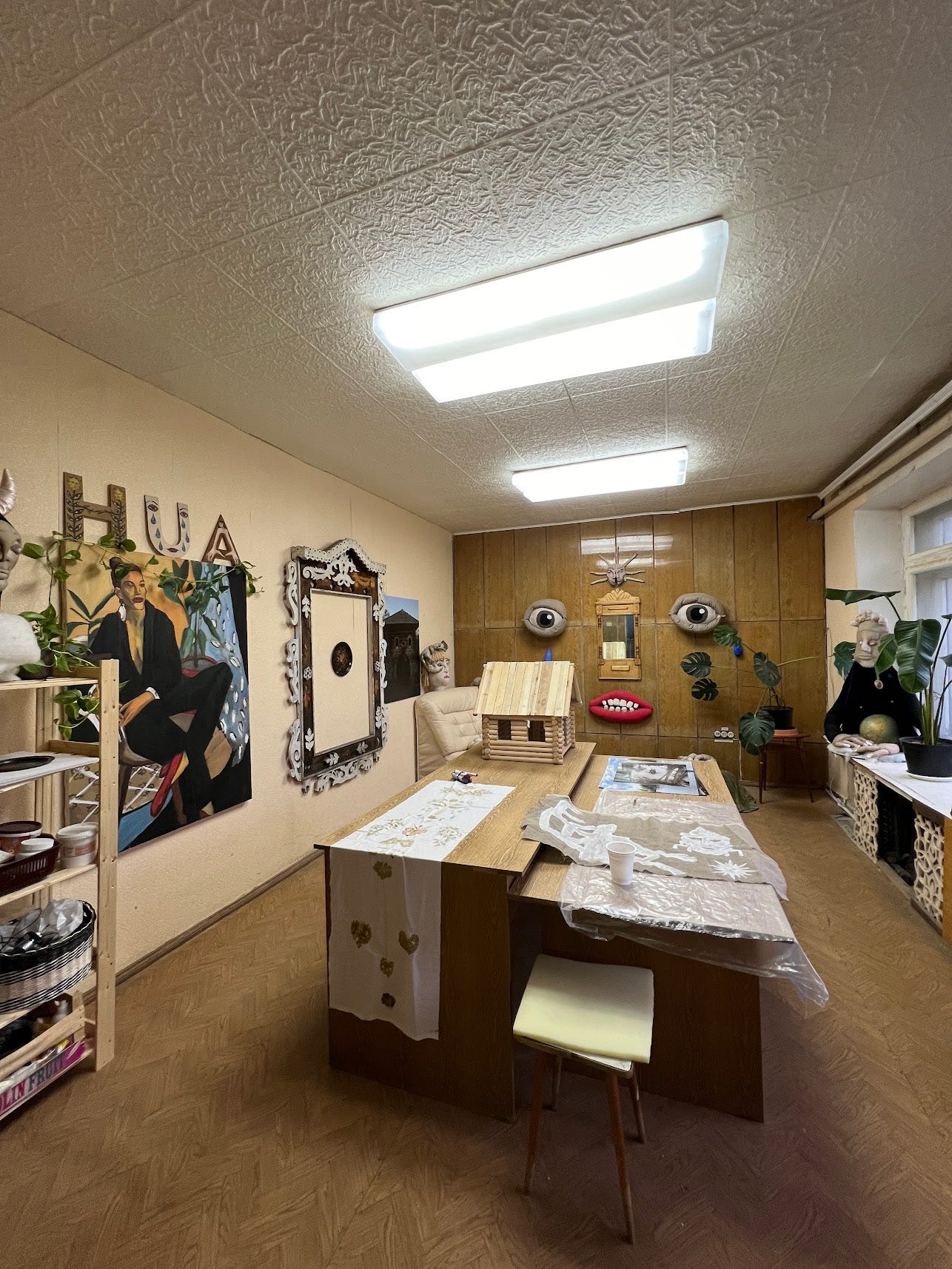 —> У меня есть две мастерские, одна находится в здании бывшей трикотажной фабрики, в кабинете директора, а другая дома. Первую я обживаю с февраля этого года, потому что в предыдущей мастерской случился потоп. Эта мастерская больше похожа на склад моих работ или выставочное пространство, иногда я пишу здесь живопись, режу что-то из дерева. В общем делаю всё то, что было бы неудобно делать дома.