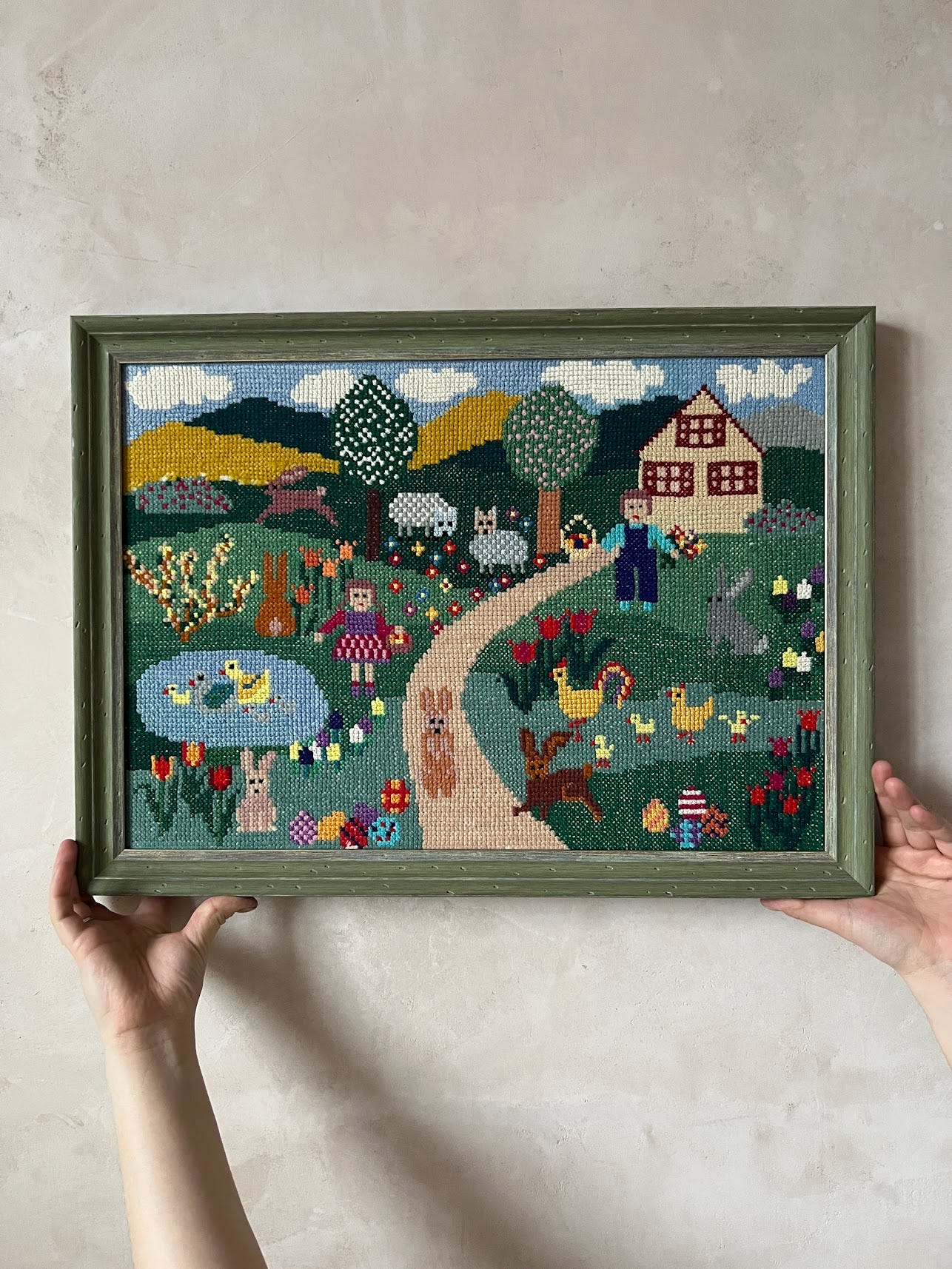 А если говорить не об одежде, а о текстильной вещи, то я бы выделила полотно с вышивкой крестиком, которую сделала бабушка мужа давным-давно. Мы оформили её в раму под музейное стекло, потому что эта работа достойна такого отношения. Думаю бабушка предсказала наше будущее и на этой картине изображена наша семья.