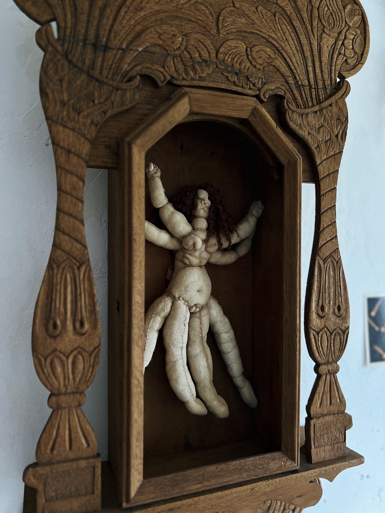 —> С первого соприкосновения с текстилем, я поняла, что это моё. Не могу объяснить почему, но даже когда я просто прихожу в галереи или музеи в качестве зрительницы, мой взгляд всегда тянется к текстильному искусству. Этот медиум отзывается больше всего. Особенно я люблю видеть антропоморфные текстильные формы. Люблю этот магический эффект подмены реальности, когда что-то напоминающее человека, становится предметом искусства.