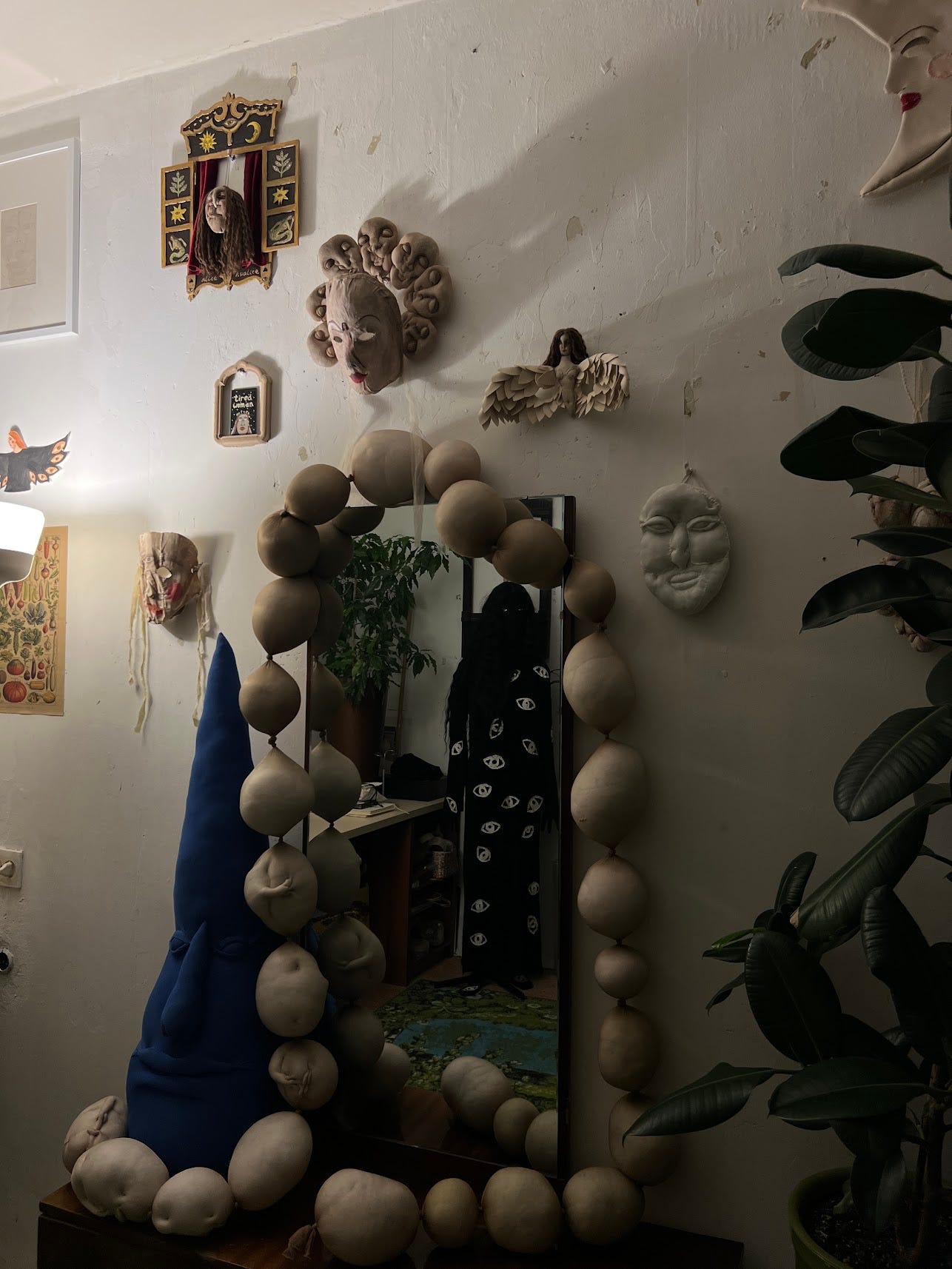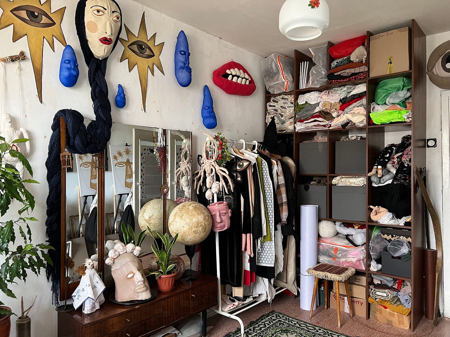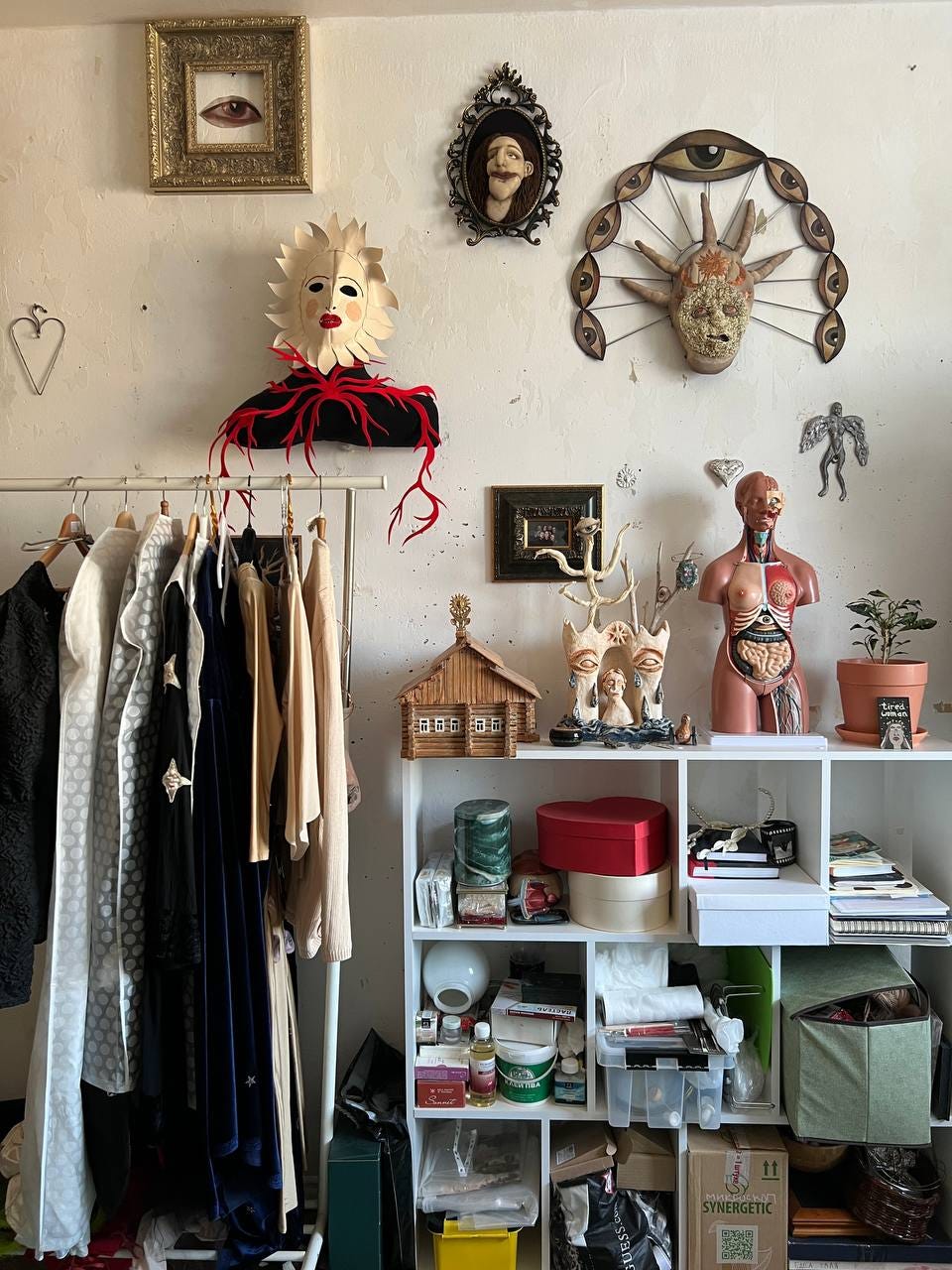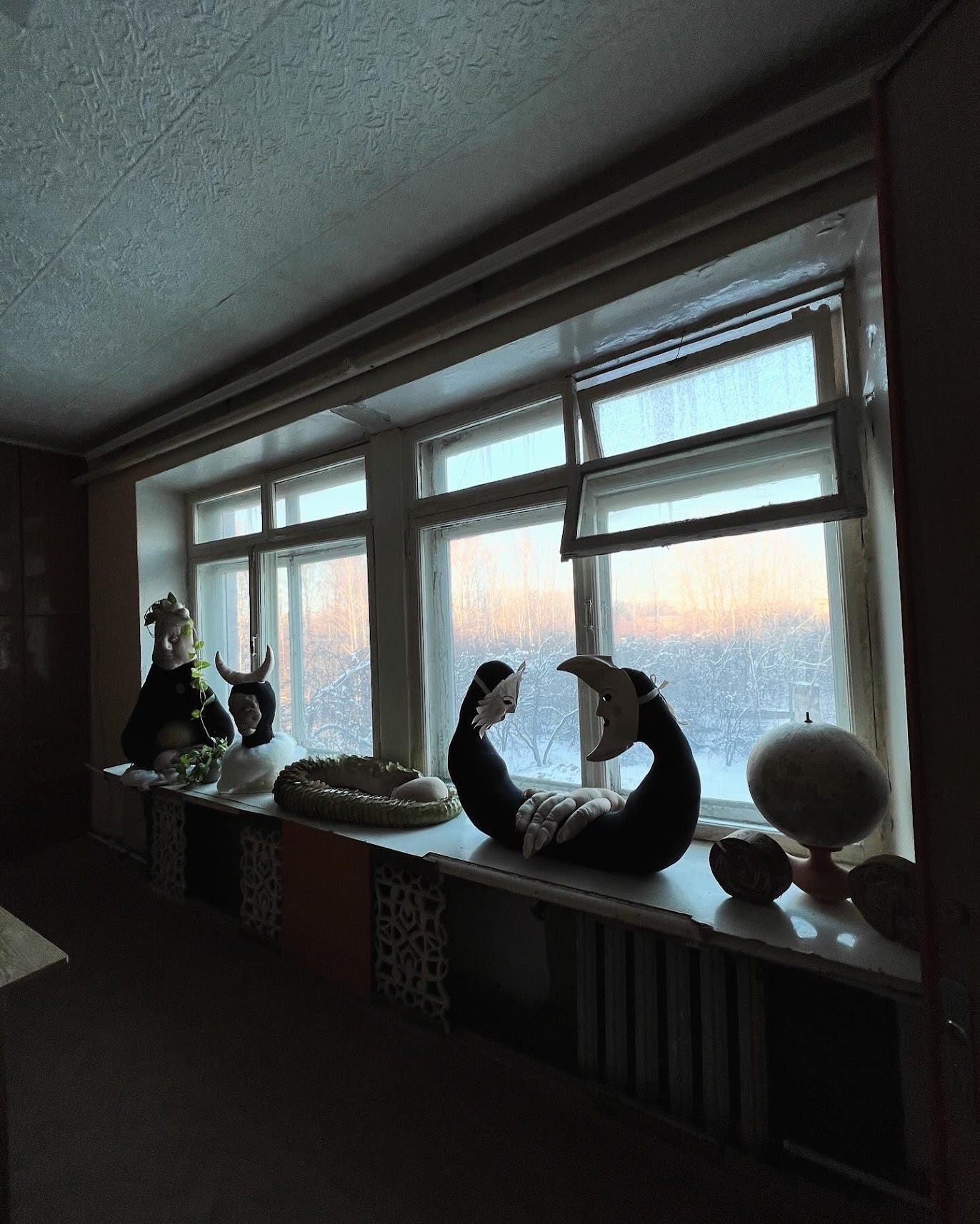 Большая часть работ создаётся в моей домашней мастерской, хотя если быть честной — дома. Да, по факту у меня есть отдельная комната, которую я называю мастерской, но я не всегда работаю именно здесь. Прелесть работы дома в том, что вся квартира становится моей мастерской, я могу работать в зале, спальне, на кухне или в той самой комнатушке, которую я именую мастерской. Где удобно — там и работаю. Хочу полепить из глины — иду на кухню, там самый удобный стол, хочу пошить что-то большое — иду в зал, тут больше всего места, хочу сделать йогу — иду в мастерскую. В общем в моей квартире жизнь и искусство перемешаны воедино, и мне так очень комфортно.