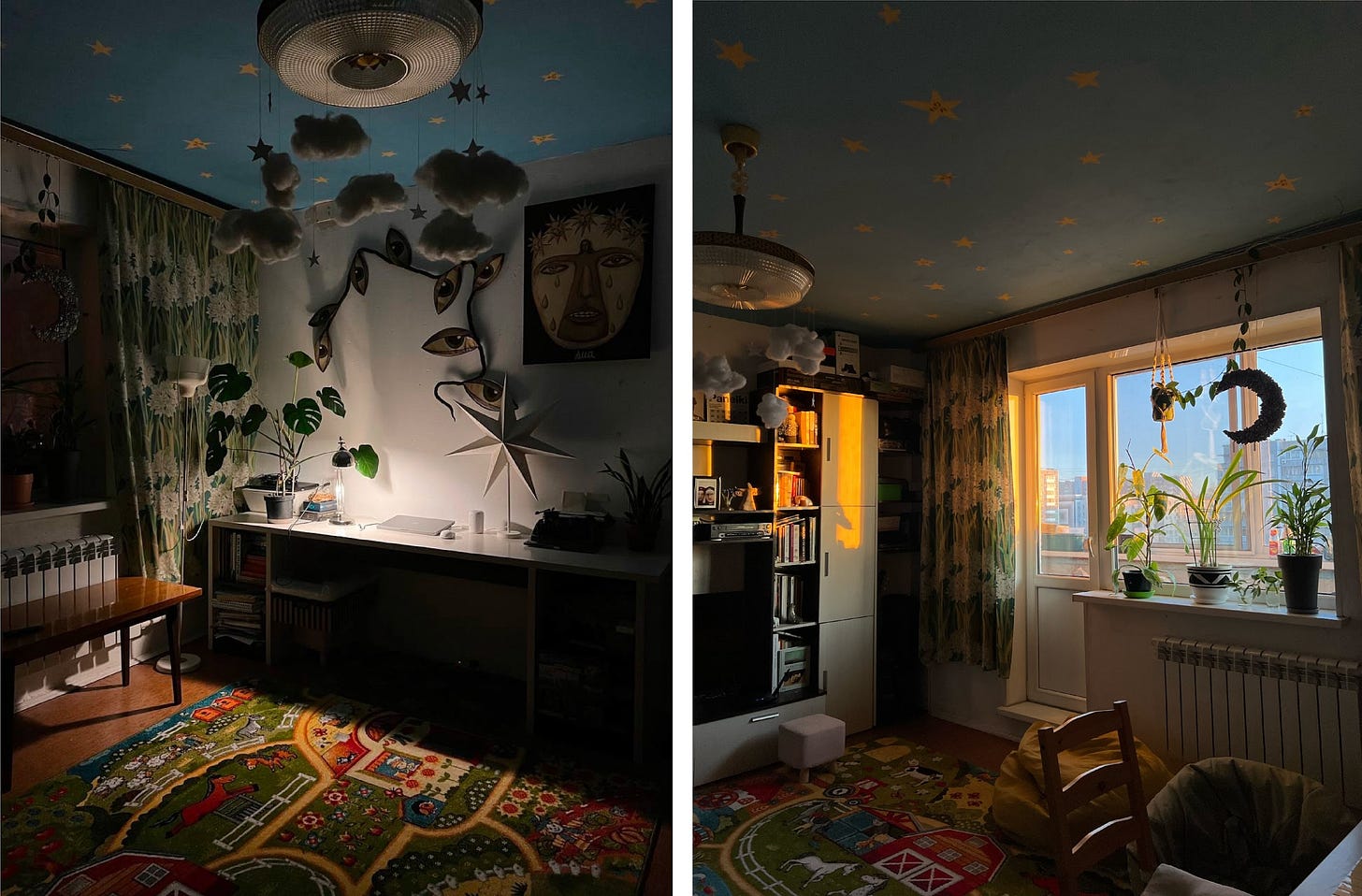 Я делаю, что хочу и моя квартира это отражает. Я могу расписать стены, потолок, двери. Неприлично занять пространство своими работами, поставить мебель не по фен-шую. Думаю дизайнеры пространств, выступающие за эргономику, в нашей кварире бы сошли с ума. Ещё интересно наблюдать, как каждый год квартира меняется, мы постоянно что-то двигаем, дополняем, переставляем. Она будто живой организм.