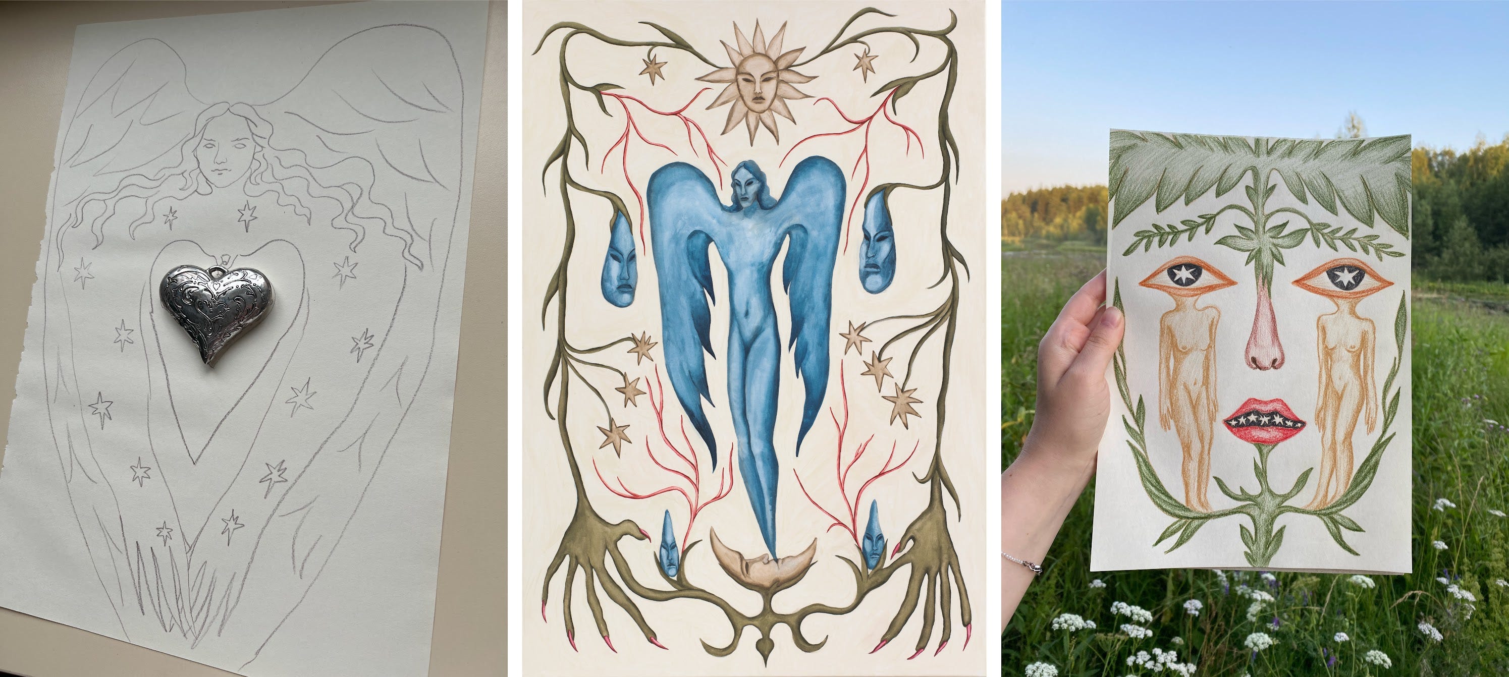 —> Перебирание старых работ, пересматривание архива, мне важно видеть сколько всего я сделала, важно копаться во всех этих образах. Каждый раз перебирая работы вижу что-то новое, что раньше не замечала.